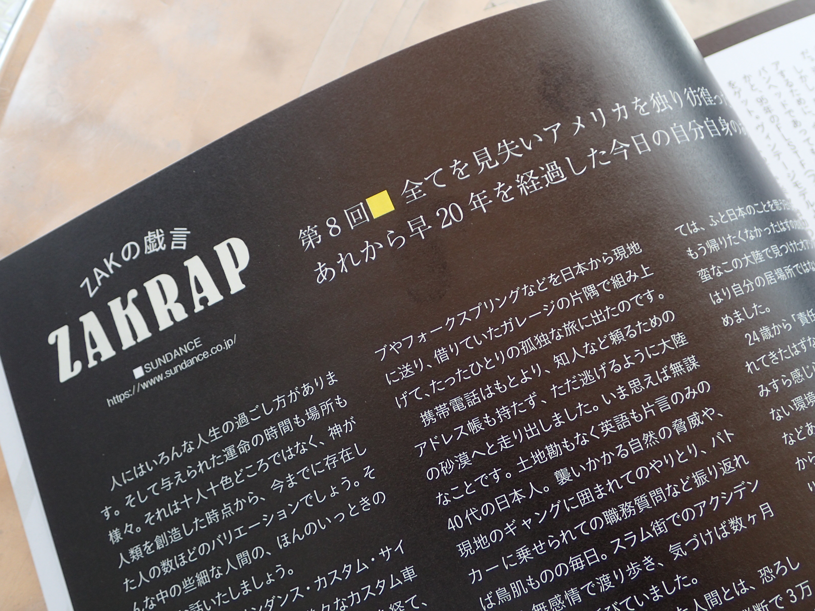 また、毎回ご好評頂いている弊社代表のZAK柴﨑による連載エッセイ、“ZAKRAP”では2000年の11月に柴﨑自身が米国大陸を46000km走破した経験から感じたことや、当時の心境についてを書かせて頂いております。