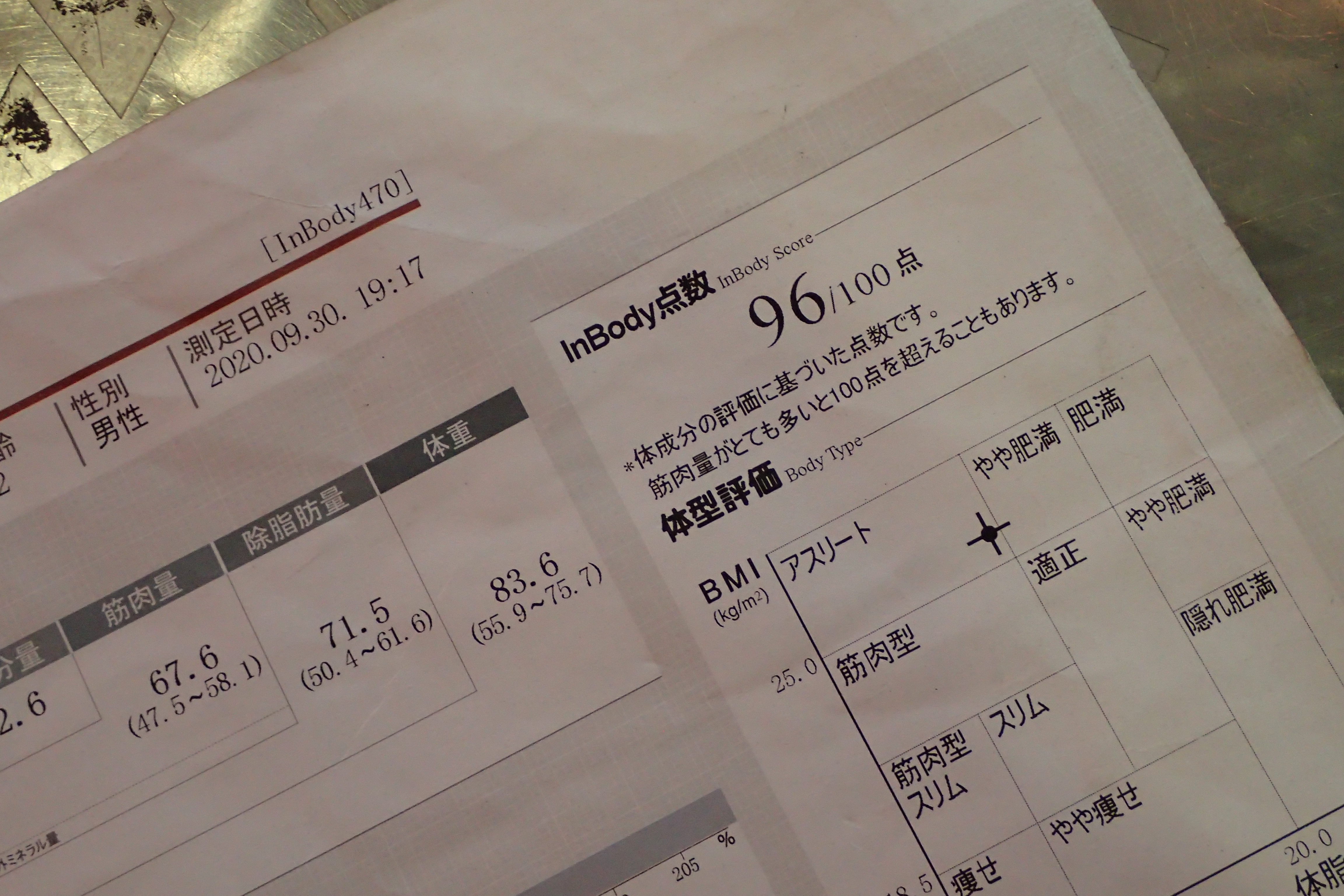 またこの「効率の良いEMSトレーニング」を「目で見て、健康状態が分かる」数値化してくださるのもジョイフィット用賀の大きな特徴のひとつ。上の「インボディ点数」でそれを示してくれるのですが、“ZAK”は100点中、96点という数値は齢64にして一流アスリートやプロ格闘家なみの点数とのことです。