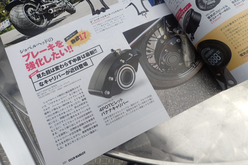 またこのクラブハーレー最新号では当社の新製品、ショベルヘッド用“4POT ビレットバナナキャリパー”もご紹介いただいております。純正のバナナキャリパーのスタイルを踏襲した上で対向4ポットを採用したこの製品に関しては以前に当ブログでも紹介しましたのでコチラもオレンジ色の部分をクリックし、あわせてご覧ください。