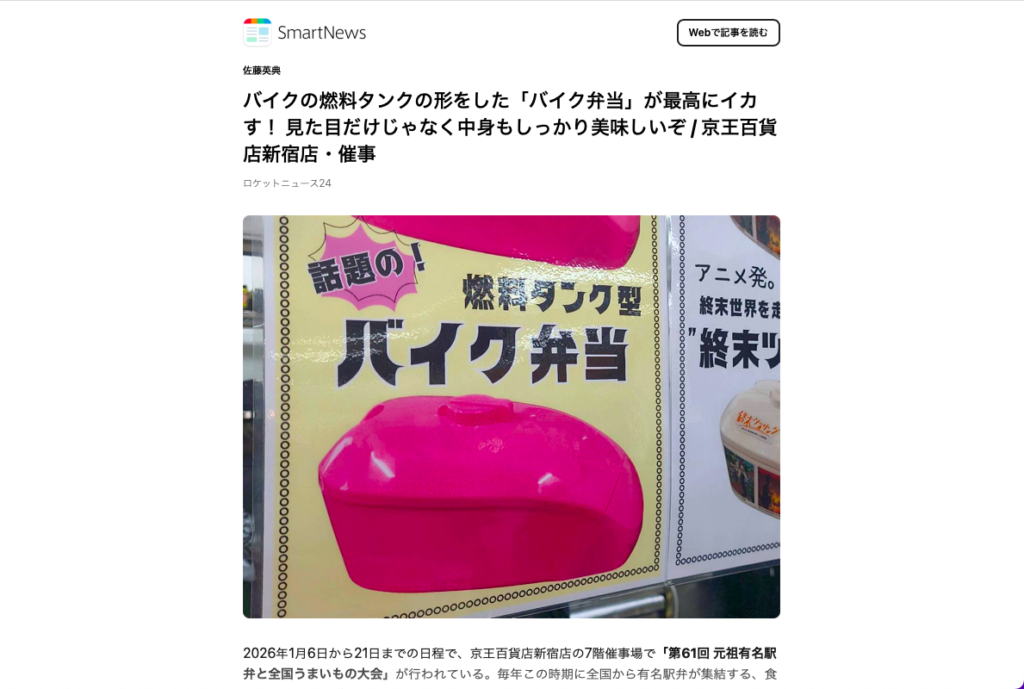 スマートニュースにて現在、新宿京王百貨店で開催中の『バイク弁当』が紹介されました。