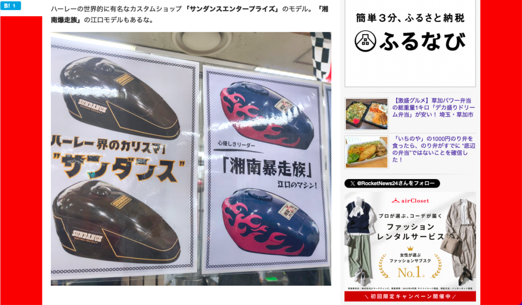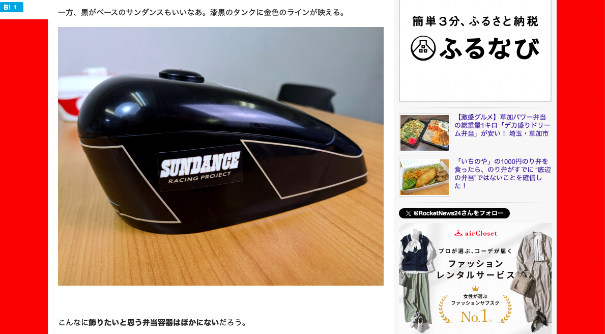 記事の中でも「こんなに飾りたいと思う弁当容器はほかにないだろう」というコメントをいただいていますが、当社のスポーツスター・レーサーの3.3ガロン・タンクを模した形状は確かにマニア垂涎のフォルムとなっています。