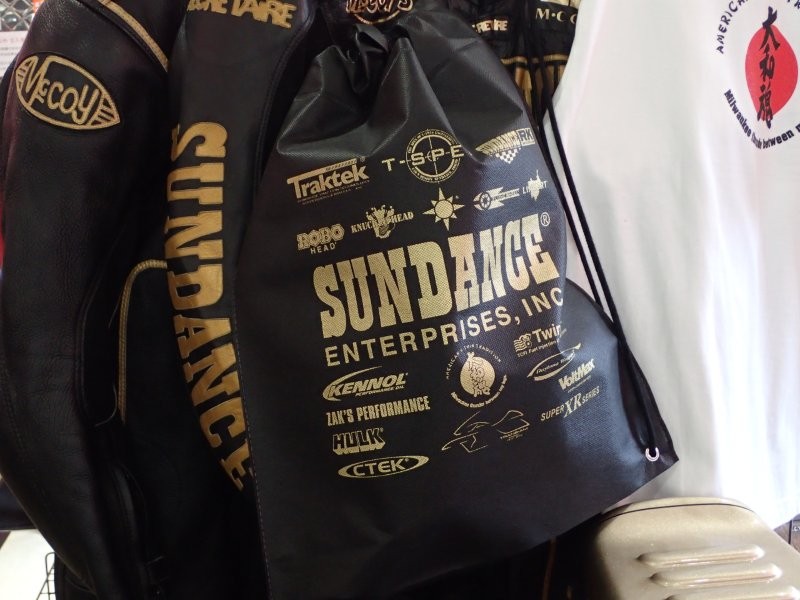 ブラック&ゴールドのショップカラーからもひと目で『サンダンス』と分かるこのバッグには、これまで当社がリリースしてきたオリジナルブランドのサスペンション、『Traktek』やブレーキキャリパーやマフラーなどのパーツに採用されるブランド『ZAK’S PERFORMANCE』、そして技術的サービス全般を指す『T₋SPEC』などのロゴが描かれているのですが、手前ミソなことを承知でいえばナカナカにカッコいいデザイン。ちなみに『KNUCKLEHEAD』というフレーズも当社サンダンスが商標登録を有していることは、世間ではあまり知られてないのではないでしょうか? 更に言えばメーカーロゴ以外のサンダンス・オリジナルブランドは、すべて商標登録済みとなっています。