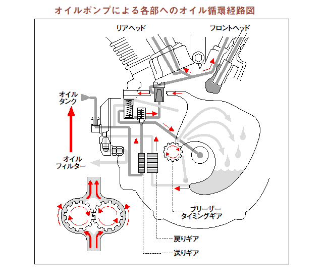 たとえばハーレーのオイルポンプは送り側より戻り側のギヤの方が大きい構造となっているのですが、オイルが温まり、柔らかくなるとオイルポンプの隙間から圧が漏れ、オイルが上がっていかなくなるという症状がおこります。そうした行程を繰り返すうちにクランクケースの中にどんどんオイルが溜まり、ブリーザーからオイルを吹いたり、内圧が上がってオイルが漏れたりするのが持病とされています。