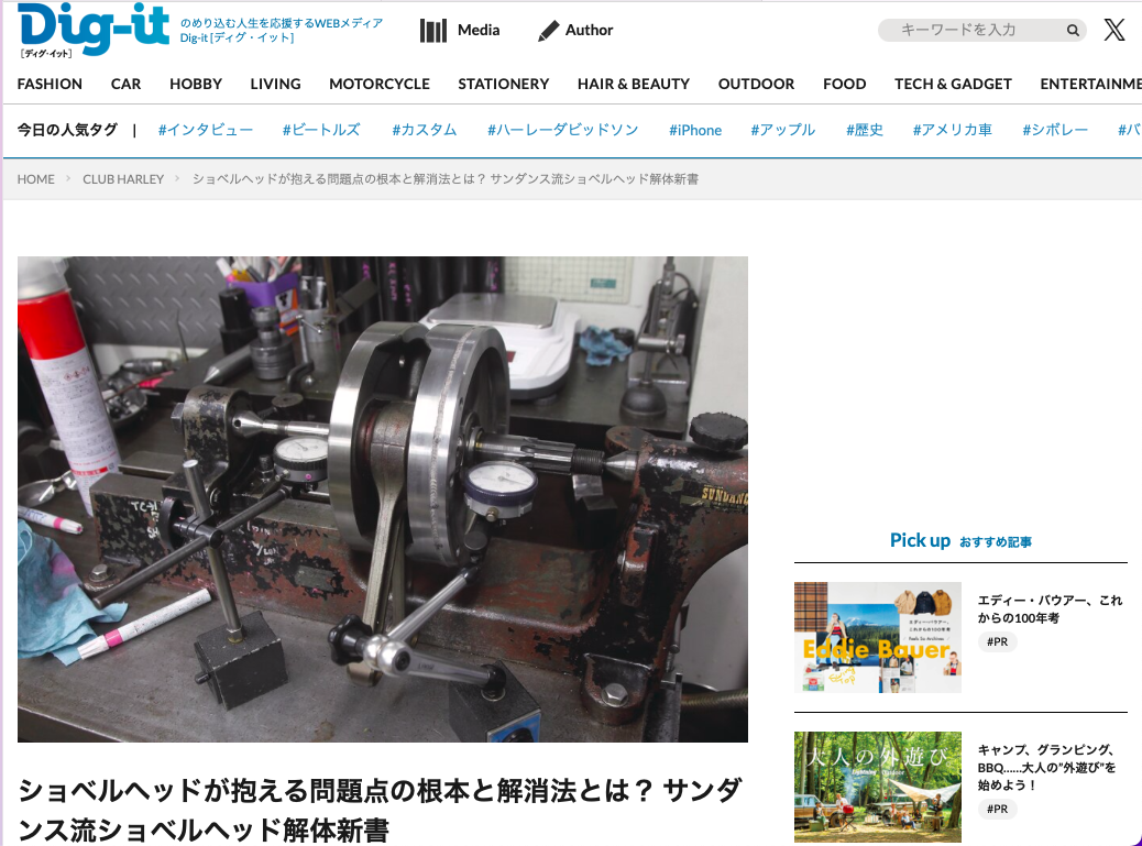 雑誌のみならず、最近はYouTubeやWebマガジン、インスタグラムなど様々なメディアが登場していますが、株式会社ヘリテイジが運営するWebサイト『Dig-it(ディグイット)』にて当社の『サンダンス流ショベルヘッド解体新書』というページが掲載されました。