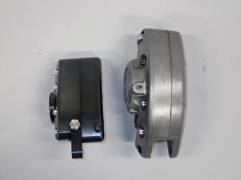 またショベル純正キャリパーの通称『バナナキャリパー』に対して『ミニバナナ』と名付けた商品名のとおり、ノーマルと比較するとサイズの違いは一目瞭然。ショベル時代の純正キャリパーといえば、その大きさと重さが原因になり、ガタつきやキャリパーピンの段減りなど多くのトラブルを抱えていましたが、もちろん当社サンダンス製は、さに非ず。過度に華美ではない落ち着いたクラシカルなスタイルの中に、現代的なパフォーマンスを与えるという当社プロダクツに共通するコンセプトで仕上げられています。